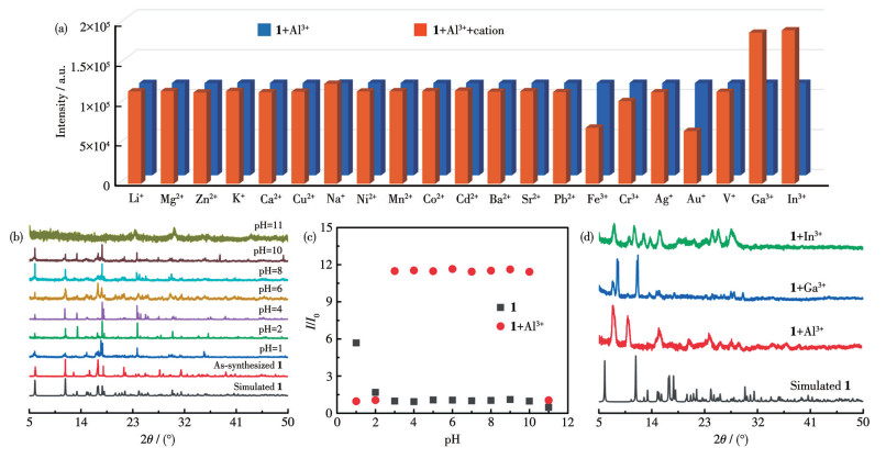 Figure 4. Evaluation of the detection performance of compound 1: (a) interference of other metal cations on the detection of Al3+ by 1; (b) PXRD patterns of the samples of 1 after being immersed in solutions of different pH values for one day; (c) luminescence intensity variations of 1 and "1+Al3+" suspensions under different pH conditions; (d) PXRD patterns of the solid samples obtained after adding Al3+, Ga3+ and In3+ ions to the suspensions of 1 respectivelyThe emission spectra that changed over time after adding 0.5 mmol·L-1 of Al3+, Ga3+, and In3+ ions, respectively, to the suspension of compound 1 were measured. The results showed that after the addition of Al3+, the luminescence intensity of the suspension increased rapidly and reached equilibrium within 120 s. After adding Ga3+ or In3+, the response time was even shorter, and the luminescence intensity reached equilibrium within 25 s. In the subsequent half an hour, the luminescence basically remained unchanged. The above results indicate that compound 1 has the advantage of rapid response as a probe for Al3+, Ga3+, and In3+ ions.