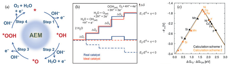 图 1 (a) 碱性OER中AEM的反应路径[34]; (b) OER的反应物与中间体的吉布斯自由能变化(蓝线表示真实的反应途径,红线表示理想的反应途径)[35]; (c) 不同催化剂的OER火山图[36]