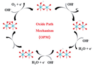AEM是最早被提出的OER机理,其在碱性条件下对应的反应方程式(其中*表示吸附中心,HO*、O*、HOO*为反应中间体)如下: