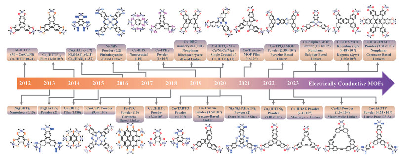 电催化剂的导电性与其电化学性能息息相关,良好的导电能力可以加快电荷传输,有利于提升材料的OER性能。然而MOFs的本征导电能力较差,传统的MOFs材料的电导率通常小于10-10 S·cm-1,这使其在电催化领域的应用面临着巨大的挑战[95]。自2009年Hiroshi Kitagawa课题组首次合成了高导电性的Cu[Cu(pdt)2]起[96],导电金属有机框架(conductive metal-organic frameworks,c-MOFs)材料受到了越来越多的关注,尤其是兼具高孔隙率与高电荷迁移率的新型MOFs材料的构建。图 7是以时间线的形式,梳理总结了具有代表性的c-MOF及其有机配体的发展历程。
