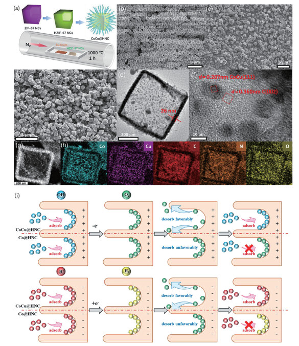 图 9 (a) CoCu@HNC催化剂的制备示意图; (b) ZIF-67、(c) 中空ZIF-67(HZIF-67 NCs)和(d) CoCu@HNC的SEM图像; CoCu@HNC的(e) TEM和(f) HRTEM图像; (g) CoCu@HNC的HAADF-STEM图像及(h) Co、Cu、C、N和O元素的EDS映射图; (i) 高电流密度下CoCu@HNC和Co@HNC的催化产物(H2与O2)的解吸示意图[107]