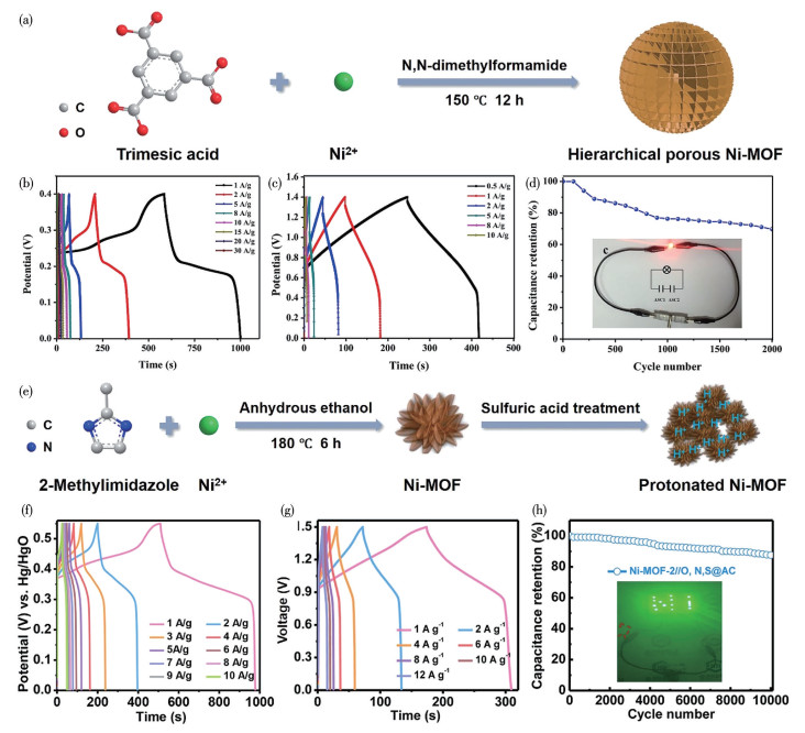 Figure 1 (a) Schematic diagram of the preparation process and (b) GCD curves at current density of 1-30 A·g-1 of porous Ni-MOF; (c) GCD curves at current densitiy of 0.5-10 A·g-1 and (d) cycling stability diagram at a current density of 5 A·g-1 of the assembled Ni-MOF//AC ASC device[24]; (e) Schematic diagram of the preparation process and (f) GCD curves at current density of 1-10 A·g-1 of nano-flower-like Ni-MOF; (g) GCD curves at current density of 1-12 A·g-1 and (h) cycling stability diagram at a current density of 5 A·g-1 of the assembled Ni-MOF//O, N, S@AC HSC device[25]