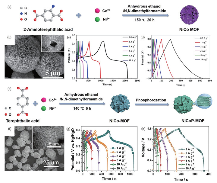 Figure 2 (a) Schematic diagram of the preparation process, (b) SEM images, (c) GCD curves at current density of 0.5-10 A·g-1 of NiCo-MOF NSHS; (d) GCD curves of the assembled NiCo-MOF NSHS//AC ASC device at current density of 0.5-10 A·g-1[33]; (e) Schematic diagram of the preparation process, (f) SEM images, (g) GCD curves at current density of 1-20 A·g-1 of NiCoP-MOF; (h) GCD curves of the assembled NiCoP-MOF//AC HSC device at current density of 1-10 A·g-1[34]