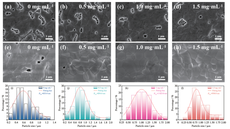 图 2e~2h为不同质量浓度PVDF条件下CsPbBr3钙钛矿薄膜的SEM图。由图可知,空白组的CsPbBr3钙钛矿薄膜(图 2e)表面存在孔洞,表面不平整,晶界较大且晶粒大小不均,导致器件性能较低。与空白组相比,不同质量浓度PVDF埋底界面修饰组的CsPbBr3钙钛矿薄膜(图 2f~2h)晶粒覆盖更完全,表面逐渐变得平整,晶界更小,晶粒更大且更加均匀,更大的晶粒尺寸和更有序的晶体结构将促进电荷传输,并抑制非辐射复合损失[30-31]。图 2i~2l统计了不同PVDF质量浓度条件下CsPbBr3钙钛矿薄膜的晶粒尺寸,随着PVDF质量浓度的升高,CsPbBr3钙钛矿薄膜晶粒的平均尺寸(Dave)出现先上升后下降的趋势。当PVDF质量浓度为1.0 mg·mL-1时,CsPbBr3钙钛矿薄膜的平均晶粒尺寸最大,达到1 023.0 nm,并且表面形貌最平整。而当PVDF质量浓度继续增大到1.5 mg·mL-1时,薄膜平均晶粒尺寸下降到938.0 nm,并且晶界处亮斑明显增多,这可能是由于富Cs杂相(Cs4PbBr6)比例的升高[32],相纯度的降低将会使得薄膜光伏性能减弱,这将在后续表征测试中得到证明。