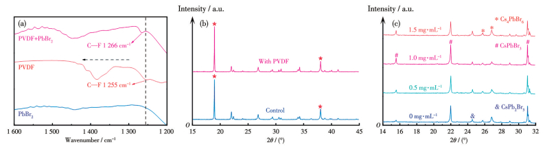图 3 (a) PVDF薄膜、PbBr2薄膜和PVDF界面修饰的PbBr2薄膜的FTIR谱图; (b) 有无PVDF埋底界面修饰的PbBr2薄膜的XRD图; (c) 不同PVDF质量浓度条件下制备的CsPbBr3钙钛矿薄膜的XRD图