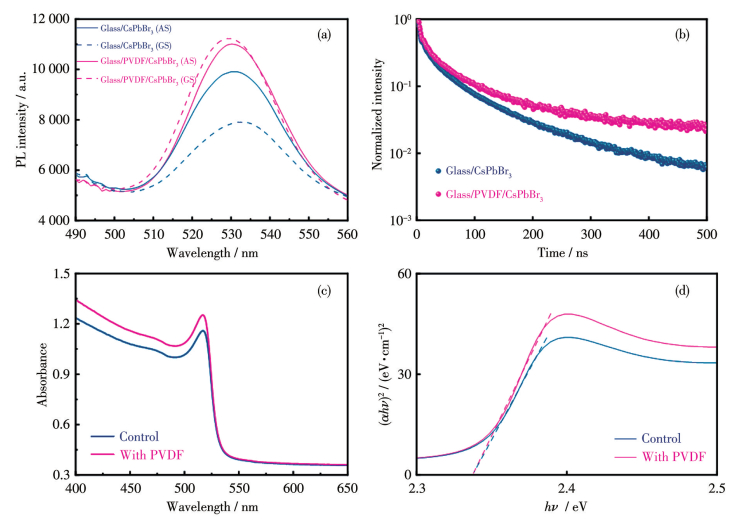 Figure 4 (a) PL spectra with different excitation directions and (b) TRPL spectra of Glass/CsPbBr3 and Glass/PVDF/CsPbBr3; (c) UV-Vis absorption spectra and (d) Tauc curves of the CsPbBr3 perovskite films with or without PVDF buried interface modification