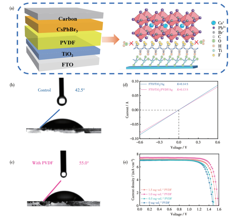 图 5 (a) PVDF埋底界面修饰示意图; (b) 空白组和(c) PVDF埋底界面修饰组CsPbBr3钙钛矿薄膜的水接触角; (d) FTO/TiO2/Ag和FTO/TiO2/PVDF/Ag的电导率曲线; (e) 不同质量浓度PVDF制备的CsPbBr3 PSC器件的J-V曲线