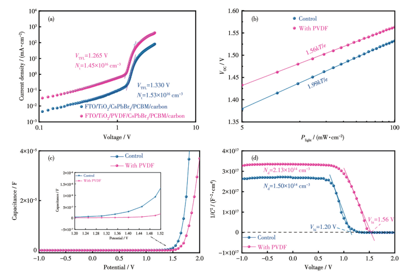图 7 FTO/TiO2/CsPbBr3/PCBM/carbon和FTO/TiO2/PVDF/CsPbBr3/PCBM/carbon的(a) SCLC曲线; 有无PVDF埋底界面修饰组PSC器件的(b) VOC与Plight的相关性曲线、(c) C-V曲线和(d) M-S曲线