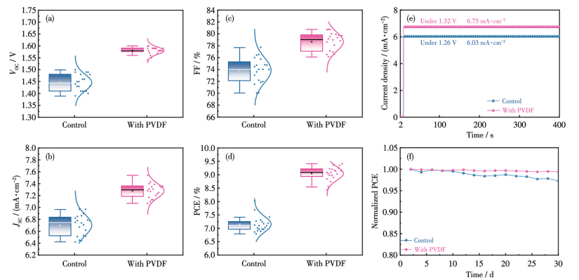 Figure 8 (a) VOC, (b) JSC, (c) FF, and (d) PCE box diagrams of the devices; (e) Steady-state output curves and (f) PCE normalized stability curves of PSC devices with or without PVDF buried interface modification