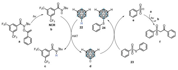 2023年,燕红课题组通过氮自由基(NCR)介导的氢原子转移(HAT)策略实现了间位碳硼烷直接的、选择性的B—H键官能团化[70](图 10)。在蓝光照射下,NCR攫取氢原子,实现了碳硼烷B—H键的HAT过程,生成了高活性的间位碳硼烷B(9)位点硼中心自由基。通过该方法成功实现了碳硼烷的硫化、硒化、炔基化、烯基化、氰基化和卤化等多种功能化反应。该方法不需要金属催化剂,具有良好的底物普适性和官能团耐受性,相应的反应机理如图 11所示。首先,在自由基引发条件下,苯乙烯基羟肟酸酯a的氮氧键发生均裂,生成高活性的NCR b。随后,NCR b与间位碳硼烷22发生HAT过程,生成B(9)位点硼中心自由基d及N-叔丁基-3,5-二(三氟甲基)苯胺c。碳硼烷自由基d与苯硫酚自由基反应,生成B(9)位点硫酚碳硼烷衍生物24。同时,反应过程中生成的芳基磺酰基自由基e转化为1-苯基-2-(苯磺酰基)乙酮f,完成催化循环。