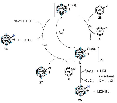 2021年,谢作伟课题组报道了使用光诱导协同金属铜催化,生成邻位碳硼烷碳中心自由基,以芳基碘化物为偶联试剂,简便地合成了多种C(1)位点芳基邻位碳硼烷和邻位碳硼烷稠环化合物[71](图 12)。该研究的创新点在于:直接使用邻位碳硼烷作为起始原料;采用廉价金属铜作为催化剂,避免了贵金属的使用;反应在室温下进行,条件温和,底物范围广等。该方法的可行性机理如图 13所示。路径一:邻位碳硼烷25与碘化亚铜在叔丁醇锂作用下,生成碳硼烷一价铜配合物a。在紫外光照射下,配合物a被一价银氧化,或者配合物a发生单电子转移过程,将电子转移给芳基卤化物,生成碳硼烷二价铜配合物b和芳基自由基c。随后,碳硼烷二价铜配合物b与芳基自由基发生偶联反应,生成C(1)-芳基邻位碳硼烷27并释放碘化亚铜完成循环。路径二:邻位碳硼烷25与氯化铜在叔丁醇锂作用下,生成碳硼烷二价铜配合物b。随后,碳硼烷二价铜配合物b与芳基自由基发生偶联反应,生成C(1)-芳基邻位碳硼烷27并释放碘化亚铜,完成循环。