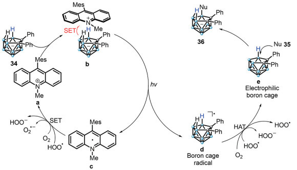 2024年,燕红课题组报道了可见光诱导的巢式硼笼活化及选择性官能团化的研究[74](图 16)。该研究利用非经典的cage…π类型的电子给体-受体(EDA)复合物策略,在绿光照射下发生单电子转移过程,生成巢式碳硼烷硼笼自由基。其中,三维的巢式碳硼烷作为电子给体,二维的吖啶阳离子作为电子受体。通过瞬态的电子顺磁共振技术,成功捕获到巢式碳硼烷自由基,并且使用泛密度函数理论计算研究了该自由基单电子的分布。通过该方法合成了一系列含有B—X(X=N、S、Se)键的碳硼烷衍生物和含硼药物分子,并对药物分子进行了生物活性测试。该反应条件温和,无需金属催化剂,以空气中的氧气为氧化剂,具有优异的产率、广泛的底物兼容性和专一的位点选择性等优点。该研究提出的可行性机理如图 17所示。首先,吖啶催化剂阳离子a与巢式碳硼烷34经过非共价的cage…π相互作用,在反应体系中生成EDA复合物b。在绿光照射下,该EDA复合物发生单电子转移过程,生成吖啶自由基c和巢式碳硼烷自由基d。随后,吖啶自由基c被氧气和过氧化氢自由基氧化回到基态a。同时,巢式碳硼烷自由基d被氧气和过氧化氢自由基氧化,发生HAT过程,生成高反应活性的中性硼笼中间体e,进一步与亲核试剂35(吡啶、咪唑、亚胺、硫醚、硒醚、硫代酰胺等)反应生成B(9)位点取代的巢式碳硼烷衍生物36。