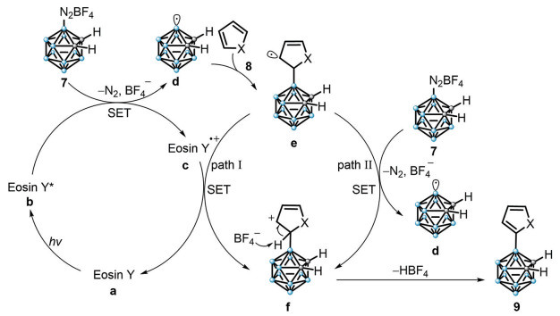 2016年,谢作伟课题组报道了一种创新性的光诱导策略,以曙红Y(eosin Y)作为光催化剂,实现了碳硼烷B(3)位点硼中心自由基的原位生成,并高效合成了B(3)位点(杂)芳基邻位碳硼烷衍生物[65](图 3)。该方法提供了一种无金属、条件温和的合成途径,避免了传统方法中金属催化剂的使用,降低了反应成本并减少了金属残留。同时,该方法具有广泛的底物兼容性和优异的区域选择性,能够与多种(杂)芳烃发生反应,为碳硼烷的精准位点修饰提供了重要的新思路。研究中提出的反应机理如图 4所示。首先,在绿光照射下,曙红Y光催化剂a被激发至高活性的中间体b。该激发态中间体b通过单电子转移(SET)过程,将电子转移给B(3)位点重氮邻位碳硼烷四氟硼酸盐7,发生一分子氮气消除,生成碳硼烷的B(3)位点硼中心自由基d。随后,该自由基d与(杂)芳烃发生亲电加成反应,生成碳硼烷中间体e。该中间体e可能经过2种路径生成目标产物。路径一:该中间体e被光催化剂自由基c氧化失去1个电子生成中间体f,进一步被四氟硼酸阴离子攫取氢离子,生成目标产物B(3)位点(杂)芳基邻位碳硼烷衍生物9。路径二:该中间体e被B(3)位点重氮邻位碳硼烷四氟硼酸盐7氧化失去1个电子生成中间体f,进一步被四氟硼酸阴离子攫取氢离子,生成目标产物B(3)位点(杂)芳基邻位碳硼烷衍生物9。
