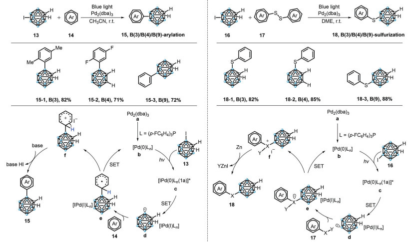 此外,谢作伟课题组还报道了使用蓝光诱导与过渡金属钯协同催化碘代碳硼烷产生自由基的方法(图 7)[67-68]。这些方法同样在邻位碳硼烷B(3)、B(4)、B(9)位点分别生成了硼中心自由基,并实现了与多种底物的偶联反应,合成了碳硼烷芳基和硫醚类化合物。反应机理与镍催化的机理类似,关键步骤为过渡金属钯攫取碘原子,生成碳硼烷硼中心自由基。