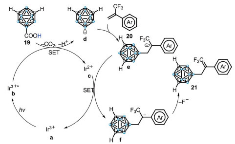 2022年,燕红课题组报道了通过光诱导脱羧反应实现间位碳硼烷选择性官能团化的新方法[69](图 8)。该方法利用光诱导氧化脱羧策略,成功生成了间位碳硼烷B(9)位点硼中心自由基,并实现了与多种底物的偶联反应,合成了包括烷基化、烯基化和(杂)芳基化产物在内的多种功能化碳硼烷衍生物。该方法具有反应条件温和、底物普适性好和官能团耐受性强等优点。此外,通过该策略合成的碳硼烷衍生物在发光材料和硼中子俘获疗法药物开发中展现出潜在应用价值。该研究不仅为碳硼烷的功能化提供了一种全新的反应模式,还通过理论计算揭示了反应能垒与硼位点电子密度的关系,为反应机制的理解和底物设计提供了理论支持。同时,该研究提出的可行性机理如图 9所示。首先,碳硼烷羧酸19在碱的作用下,形成碳硼烷羧酸阴离子。在蓝光照射下,光催化剂三价铱配合物a被激发至高活性的中间体b。随后,中间体b氧化碳硼烷羧酸阴离子,发生单电子转移过程,生成二价铱配合物c和碳硼烷硼B(9)位点硼中心自由基d。接着,该自由基d对三氟甲基苯乙烯化合物20进行自由基加成,生成中间体e。随后,二价铱配合物c被中间体e氧化,发生单电子转移过程,回到基态三价铱配合物a。同时,生成阴离子中间体f,再经过β-氟消除反应生成B(9)位点烷基碳硼烷衍生物21。