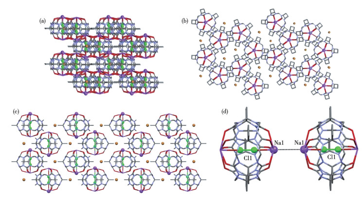 Figure 3  Stacking diagram and 1D molecular chain of complex 1: stacking diagram along (a) a-axis, (b) b-axis, and (c) c-axis, respectively; (d) 1D molecular chain (water molecules, chloride ions, and perchlorate ions are omitted for clarity)