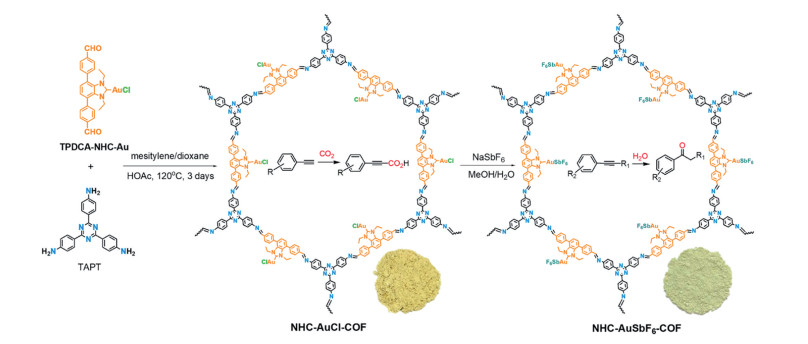 Figure 1. Synthesis process and catalytic application of NHC-AuCl-COF and NHC-AuSbF6-COF[101]Figure 2