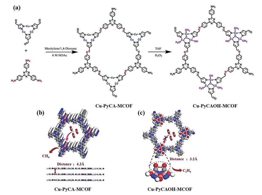 Figure 3. (a) Schematic representation of the synthesis of Cu-PyCA-MCOF and Cu-PyCAOH-MACOF; Views of (b) Cu-PyCA-MCOF and (c) Cu-PyCAOH-MCOF structural models (C: gray, N: blue, O: red, Cu: pink, and H: white)[108]1.2 Acetate as the main reduction product