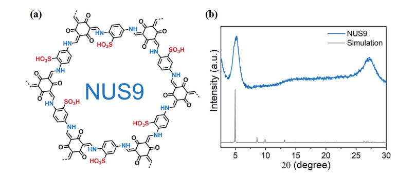 Figure 7. (a) Chemical structure of NUS9; (b) Typical PXRD patterns of NUS9 nanosheets with an eclipsed stacking model[112]Figure 8