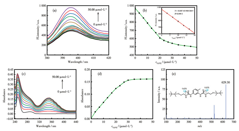 Figure 8 (a) Fluorescence spectra and (b) corresponding fluorescence intensity at 395 nm, (c) UV-Vis absorption spectra and (d) corresponding absorbance at 350 nm with adding Cr(Ⅵ) at different concentrations (0, 3.33, 6.67, 10.00, 13.33, 16.67, 20.00, 23.33, 26.67, 30.00, 35.00, 40.00, 45.00, 50.00 μmol·L-1) of T1; (e) ESI-MS spectrum of T1 after addition of Cr(Ⅵ)