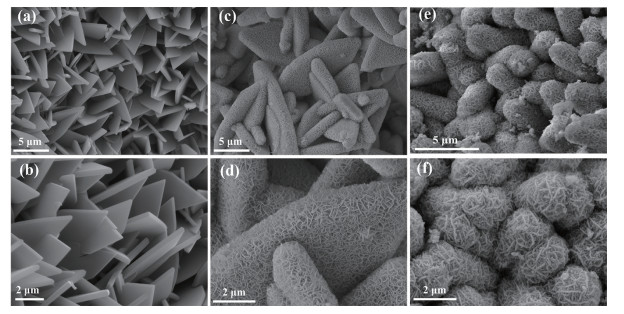 Figure 2.  SEM images of (a, b) ZIF-67/NF, (c, d) CoMoO4/NF-120℃, and (e, f) FeOOH@CoMoO4/NF-400s