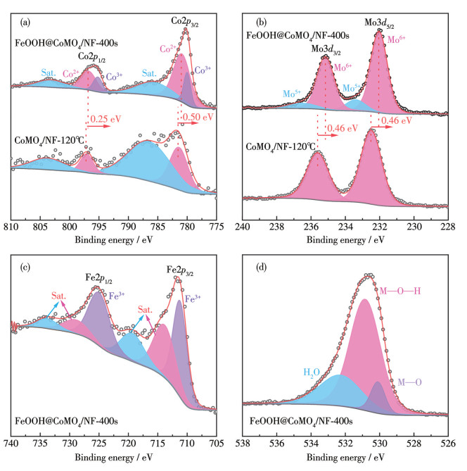 XPS results in Fig.4 displayed the individual element chemical state of the as-prepared catalysts, and the C1s (284.80 eV) peak was used to correct all element spectra. As shown in the full XPS spectrum (Fig.S7), the C, Ni, Co, Mo, Fe, and O signals were detected on FeOOH@CoMoO4/NF-400s. The C1s spectra displayed three evident peaks, situated at 284.80, 286.31, and 288.60 eV, which were ascribed to C—C, C—O, and C=O bonds, respectively (Fig.S8). The Ni2p spectra of CoMoO4/NF-120℃ and FeOOH@CoMoO4/NF-400s are presented in Fig.S9. Four significant peaks were observed at the binding energy of 850-890 eV, which are attributed to the nickel source derived from NF participating in the hydrothermal reaction. In the Ni2p spectrum of FeOOH@CoMoO4/NF-400s, two main peaks of 856.05 and 874.00 eV are attributed to Ni2p3/2 and Ni2p1/2, revealing the existence of Ni2+. As for CoMoO4/NF-120℃, the Ni2+ peaks were located at 855.52 and 873.01 eV[33-34]. Therefore, the Ni element mainly existed in the form of Ni2+ doping into the catalyst. In Fig.4a, two main peaks located at 781.40 and 797.06 eV belong to Co2p3/2 and Co2p1/2 of Co2+ ions in CoMoO4/NF-120℃, while other peaks at 786.42 and 803.15 eV correspond to satellite peaks[35-36]. Compared to CoMoO4/NF-120℃, the binding energies at 780.90 eV (Co2p3/2) and 796.81 eV (Co2p1/2) of FeOOH@CoMoO4/NF-400s displayed a negative shift by 0.50 and 0.25 eV, indicating that the existence of Fe increased the electron cloud density around Co atoms. Additionally, another two main peaks at 779.98 and 795.20 eV were detected in FeOOH@CoMoO4/NF-400s, which were indicative of the appearance of Co3+ after electrodepositing FeOOH[37], attributing to the oxidation of Co exposed on the surface of FeOOH@CoMoO4/NF-400s[38]. The Mo3d spectra in Fig.4b of CoMoO4/NF-120℃ were deconvoluted into two peaks at 232.49 (Mo3d5/2) and 235.61 eV (Mo3d1/2), and their difference in binding energy was 3.12 eV, suggesting the presence of Mo6+ ions[39-41]. For FeOOH@CoMoO4/NF-400s, the peaks at 232.03 (Mo3d5/2) and 235.15 eV (Mo3d1/2) were all negatively shifted by 0.46 eV, signifying that Fe tailored the electronic structure of CoMoO4, promoting electron delocalization toward Co. Interestingly, two new peaks at 233.39 and 236.48 eV of FeOOH@CoMoO4/NF-400s are corresponded to Mo5+, indicating that Fe would promote the formation of lower oxidation state of Mo (Mo5+)[42-43]. Additionally, partial reduction of Mo6+ to Mo5+ is driven by a charge compensation effect, maintaining electroneutrality when Co2+ was oxidized to Co3+ during the electrodeposition process. The negative shift of FeOOH@CoMoO4/NF-400s in Co2p and Mo3d XPS spectra revealed the electronic transfer from FeOOH to CoMoO4, indicating a strong electronic coupling between CoMoO4 and FeOOH that modulated the electrocatalytic activity. For Fe2p spectra (Fig.4c), the observed peaks at 711.21 and 724.98 eV are assigned to Fe2p3/2 and Fe2p1/2, respectively, verifying the presence of Fe3+ formed in FeOOH[44]. Four additional peaks at 713.85, 719.32, 728.86, and 733.74 eV are ascribed to shakeup satellite peaks[45]. The deconvoluted O1s XPS spectrum is presented in Fig.4d, and three constituents centered at 530.10, 530.84, and 532.28 eV are assigned to M—O (M=Co, Mo, and Fe), M—O—H, and H2O, respectively[46-47].