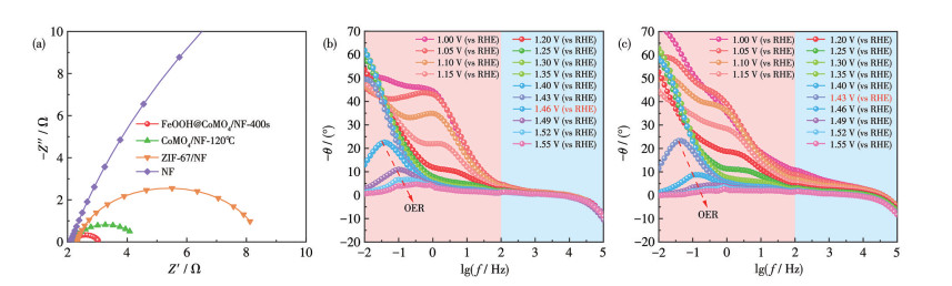 Figure 6  (a) Nyquist plots of the samples at 1.50 V (vs RHE), Bode plots at various potentials of (b) CoMoO4/NF-120℃ and (c) FeOOH@CoMoO4/NF-400s