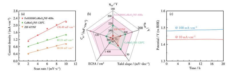 Figure 7  (a) Cdl curves and (b) performance comparison radar chart of the samples; (c) 20 h chronoamperometric curves of FeOOH@CoMoO4/NF-400s