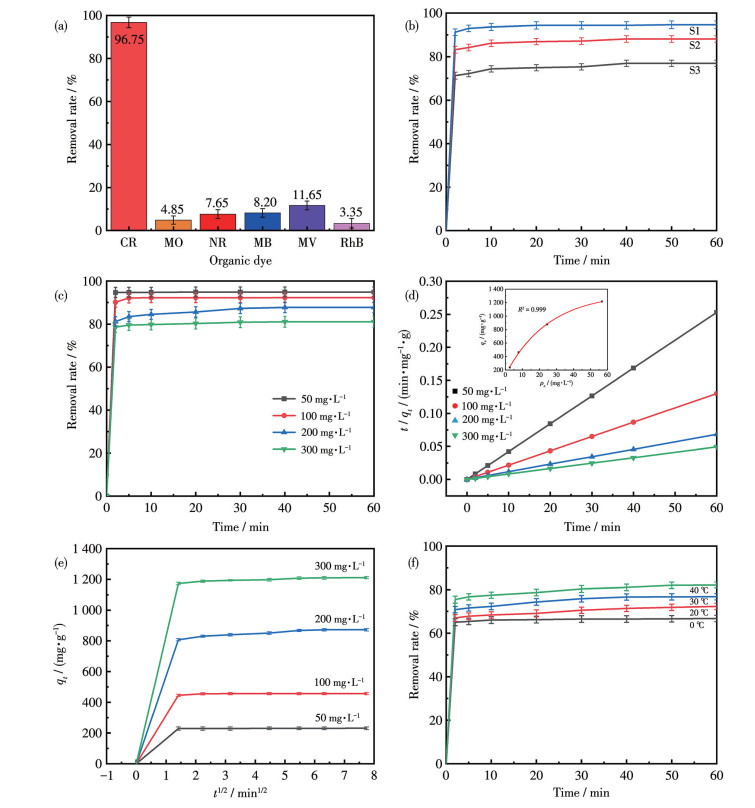 Figure 3 (a) Removal rates of S1 for different dyes (20 mg·L-1): (b) Removal rates of the different samples for CR (100 mg·L-1); (c) Removal rates of S1 towards different mass concentrations of CR; (d) Pseudo-second-order kinetic model and Langmuir isotherm model (inset) of S1 towards different mass concentrations of CR; (e) Intra-particle diffusion model of S1 towards different mass concentrations of CR; (f) Temperature-dependent removal rates of S1 towards CR (300 mg·L-1)