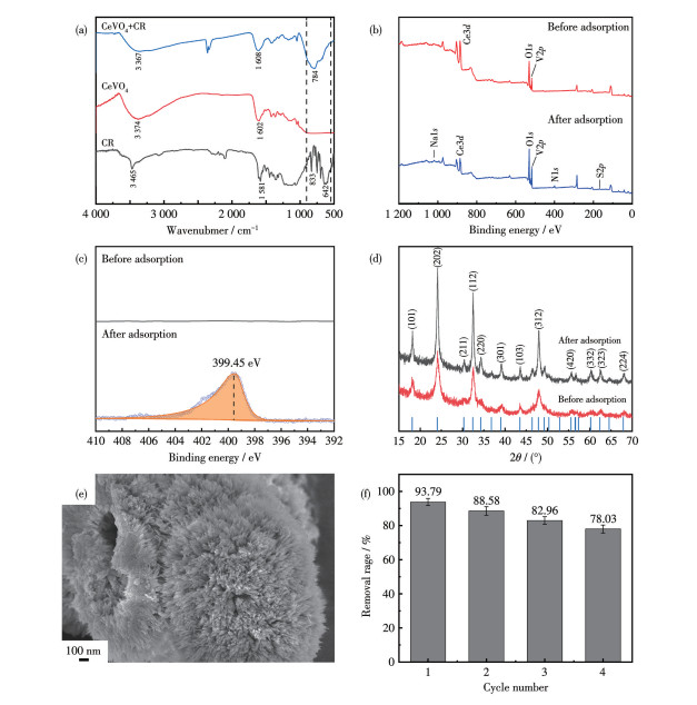 表 3 CeVO4空心球对CR的吸附热力学参数Table 3. Adsorption thermodynamic parameters of CeVO4 hollow microspheres towards CRT / ℃ ΔG⊖ / (kJ·mol-1) ΔH⊖ / (kJ·mol-1) ΔS⊖ / (J·mol-1·K-1) 0 -6.185 14.10 73.79 20 -7.471 30 -8.193 40 -9.330 为了揭示吸附反应的本质,对吸附一次后的样品进行了多项测试表征。FTIR表征结果如图 4a所示,吸附后的样品在700~900 cm-1的范围内出现CR的特征峰,表明CR分子吸附在样品表面,同时证实其对CR的吸附是物理吸附。通过XPS表征了CeVO4吸附CR前后的化学状态和表面组成,如图 4b所示,除Ce、V和O外还发现了Na、S和N的存在,证明了CR的存在。另外,纯CR分子中的—NH2位于398.96 eV[20-21],而吸附后样品的N1s的结合能移至399.45 eV(图 4c),这可能是由于CeVO4空心微球中裸露的O原子与CR分子中的—NH2基团之间形成了氢键。吸附后的XRD图(图 4d)进一步表明,吸附前后CeVO4的晶相未发生改变,未发现其他物质的存在,再次证实该反应是物理吸附过程且样品化学性质稳定。吸附剂的稳定性及长效性对吸附剂的实际应用具有重要意义,如图 4e所示,吸附实验后所回收样品的SEM图显示其仍为纳米线自组装的空心球结构,表明吸附剂具有良好的结构稳定性。如图 4f所示,CeVO4吸附剂对CR的去除率在4次循环后仍高达78.03%。因此,良好的形貌稳定性和化学稳定性赋予了CeVO4空心球良好的循环使用性,可应用于实际的染料废水处理中。