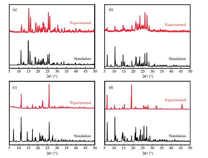 The experimental PXRD data for samples 1, 2, 3, and 4 were compared with the corresponding simulated data from single-crystal X-ray diffraction (Fig.6). The comparison revealed that the diffraction peaks of the experimental and simulated data were in good agreement, indicating that the respective crystal phases of the complexes are pure.