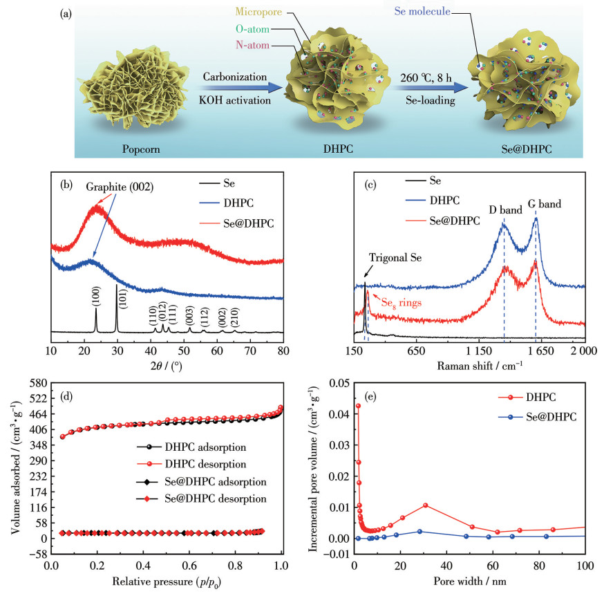 Figure 1.  (a) Synthesis process schematic of Se@DHPC; (b) XRD patterns and (c) Raman spectra of pure Se, DHPC, and Se@DHPC; (d) N2 adsorption-desorption isotherms of DHPC and Se@DHPC at 77 K; (e) Pore-size distribution curves of DHPC and Se@DHPC calculated via the BJH method