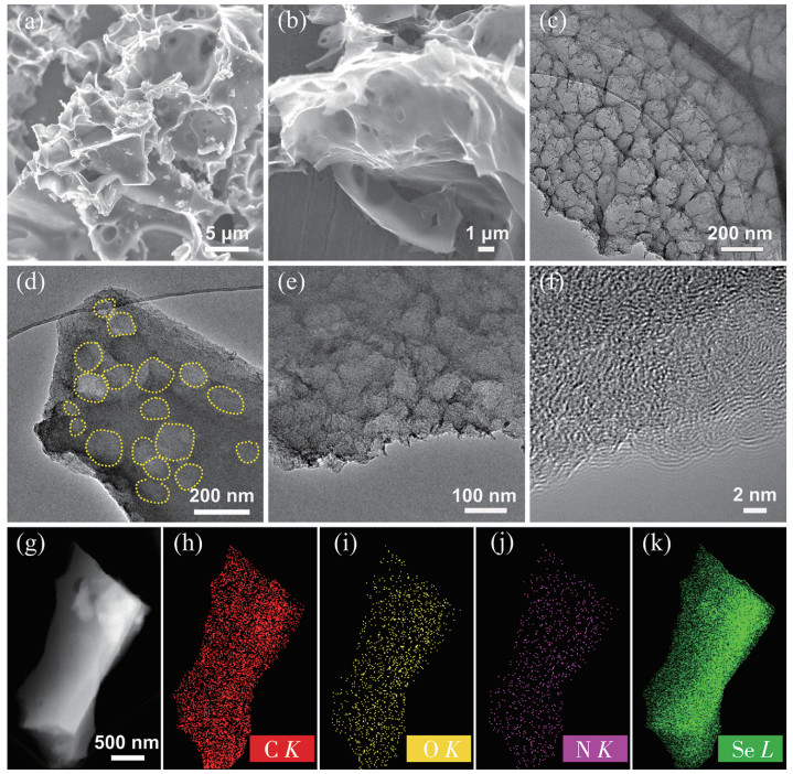 The SEM images in Fig.2a and 2b depict the three-dimensional honeycomb-like structure of DHPC with an interconnected porous structure. The TEM (Fig.2c) analysis of DHPC revealed a hierarchical porous surface and structure. As illustrated in Fig.2d and 2e, the porous features and microstructure could be well- maintained after Se loading, and no noticeable Se particles or powders could be observed on the exterior surface of Se@DHPC. High-resolution transmission electron microscopy (HRTEM) image (Fig.2f) showed only the highly disordered sp2 carbon lattice fringes of DHPC, demonstrating the amorphous nature of the Se loaded in Se@DHPC[21-23]. The above results showed the successful encapsulation of the majority of the Se into the inner pore of the DHPC matrix. Furthermore, the elemental distribution revealed the uniform spatial distribution of Se, N, C, and O elements in Se@DHPC, as shown in Fig.2g-2k.