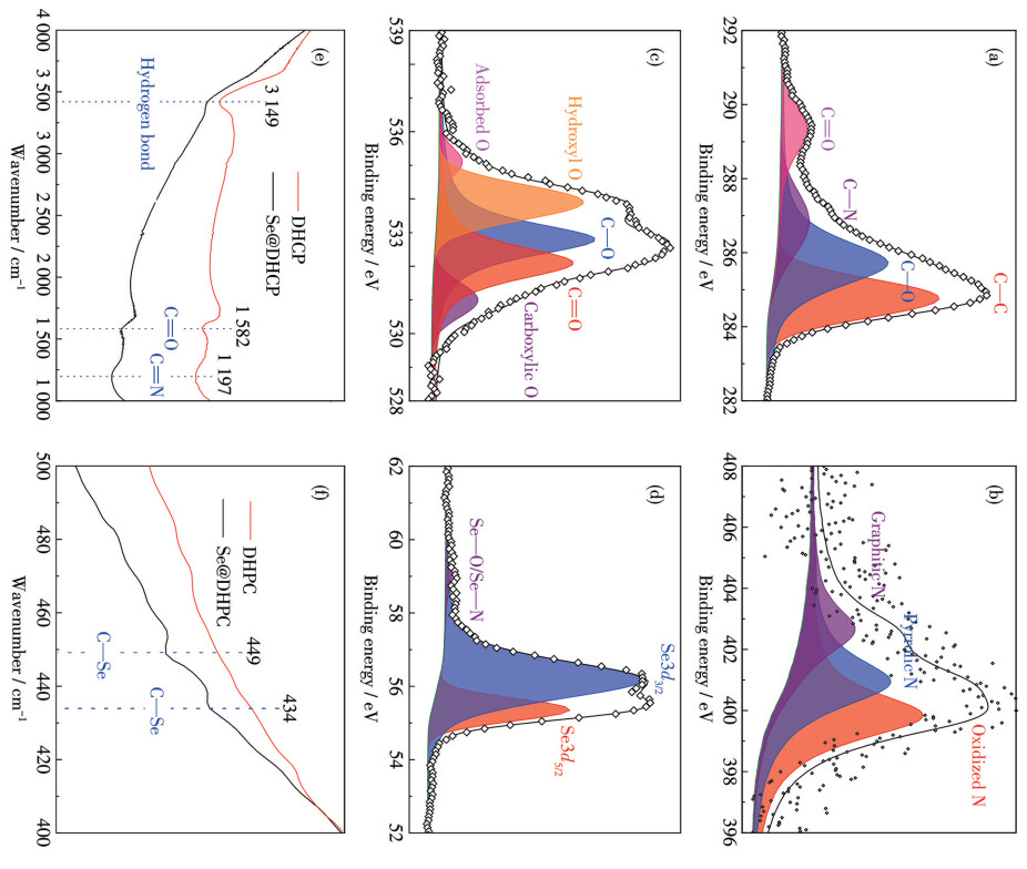 Figure 3  (a) C1s, (b) N1s, (c) O1s, and (d) Se3d XPS spectra of Se@DHPC; (e, f) FTIR spectra of DHPC and Se@DHPC