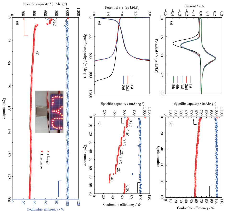 Figure 4  Li-Se battery performance based on Se@DHPC cathode: (a) CV curves at a sweep rate of 0.1 mV·s-1; (b) cycling performance at 0.2C; (c) galvanostatic discharge/charge curves for the 1st, 2nd, and 3rd cycles at 0.2C; (d) rate performance under various current densities; (e) long cycling performance at 4C