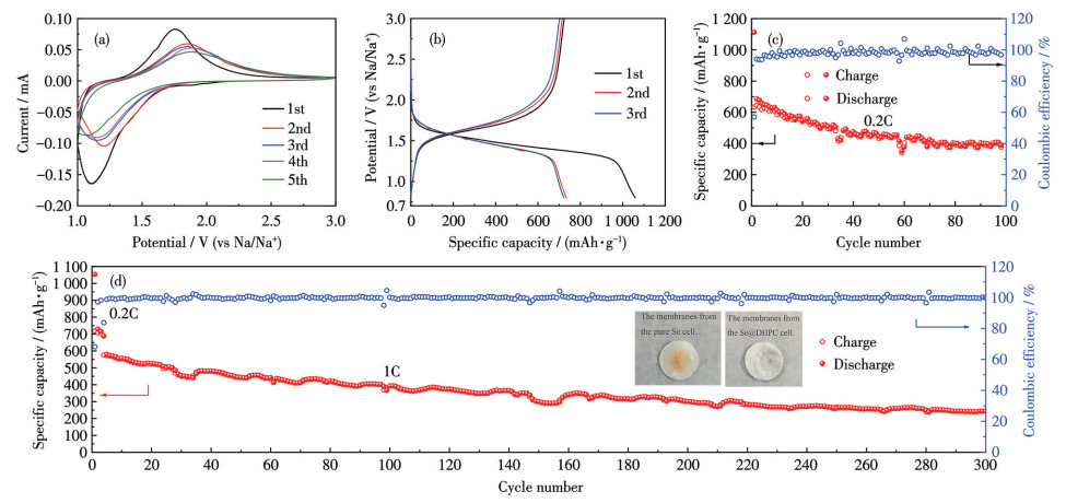 As discussed above, the Se@DHPC hybrid material had excellent properties for lithium storage. Considering the electrochemical similarity between lithium and sodium storage, we further investigated the energy storage characteristics of Se@DHPC as a cathode electrode for Na-Se batteries. As expected, Se@DHPC also exhibited good electrochemical properties in Na-Se batteries containing 1 mol·L-1 NaClO4 with the EC/DEC electrolyte. We first investigated the CV characteristics of Se@DHPC during sodium storage, as shown in Fig.5a. The cathodic peaks at 1.11 V and anodic peaks at 1.75 V in the first cycle are attributed to the redox reaction of Se and Na+ ions, which moved to a higher voltage and remained stable subsequently. From the second cycle, the shift of the cathodic peak to 1.20 V indicates the formation of Na2Se2[24]. Next, we investigated the galvanostatic cycling performance of Se@DHPC in Na-Se batteries, as shown in Fig.5b. Encouragingly, the initial discharging and charging capacities were 1 058 and 723 mAh·g-1, respectively. The Coulombic efficiency of the first cycle was nearly 58%. The capacity loss is due to the irreversible capacity of the DHPC matrix and the formation of the SEI film. The cycling performance of Se@DHPC for sodium storage was slightly worse than that of lithium storage, which is essentially due to the poor kinetics of the electrochemical reaction attributed to the larger radius of Na+ and the volume expansion. As shown in Fig.5c, the reversible specific capacity of Se@DHPC in Na-Se batteries after 100 cycles at 0.2C was 404 mAh·g-1, corresponding to a specific capacity retention rate of 59.0%, verifying the relatively stable electrochemical performance of Se@DHPC. In contrast, the pure Se and DHPC electrodes showed a relatively inferior electrochemical performance, as shown in Fig.S7a and S7b. Fig.5d shows the long cycling characteristics of the Se@DHPC cathode. In the initial three cycles, the electrode provided a reversible capacity of 688 mAh·g-1 at 0.2C. Even at a high current density of 1C, a high discharge specific capacity of 343 mAh·g-1 could be maintained after 300 cycles. Notably, the glass fiber separator in the Na-Se battery assembled with Se@DHPC cathode showed a much lighter color than that with a pure Se electrode, as depicted in the insets of Fig.5d, indicating the sufficient inhibition of polyselenide shutting by the DHPC matrix. Furthermore, the honeycomb-like morphology of Se@DHPC did not change after 100 cycles at 0.1C (Fig.S8a, S8b), because the DHPC matrix effectively buffered the volume change.