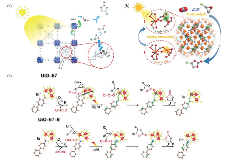 MOFs have emerged as promising photocatalysts for CO2 conversion into cyclic carbonates, owing to their unique structural advantages over conventional catalysts[13]. Their tunable pore architectures and abundant Lewis acid-base sites enable synergistic activation of both CO2 and epoxides, effectively lowering the energy barrier for ring-opening reactions. The photocatalytic mechanism in MOFs originates from light absorption by conjugated organic ligands, which generates excitons that undergo directional charge transfer to metal clusters through well-defined coordination pathways[14-15]. However, the practical application of MOF-based photocatalysts faces two fundamental challenges: narrow photo-response range and inefficient charge carrier separation[16]. This review aims to provide a comprehensive overview of recent progress in MOF-based photocatalytic systems for CO2 cycloaddition, systematically elucidating the structure-activity relationship in MOF-based photocatalysts, with particular focus on innovative design strategies to address these limitations, including extending the photo-response range through ligand engineering and sensitization, and enhancing charge separation efficiency via structural modifications and heterojunction construction. By comprehensively analyzing these approaches, we establish guidelines for developing high-performance MOF-based photocatalysts for sustainable CO2 utilization.