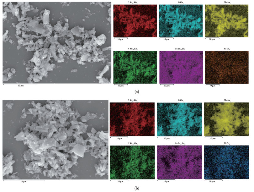 Material* Mass fraction/% C H N Mo8-CP 21.96 2.47 11.35 Mo8-CP-Eu3+ 17.73 1.69 9.85 Mo8-CP-Tb3+ 18.12 1.74 9.98 *Mo8-CP-Eu3+: Mo8-CP after Eu3+ exchange; Mo8-CP-Tb3+: Mo8-CP after Tb3+ exchange. Figure 11