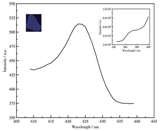 Microporous CPs with negatively charged groups can achieve precise replacement of cations in the channels through ion exchange strategies, thereby constructing functional composite materials[42-44]. The advantage of this strategy lies in its ability to directionally introduce a variety of functional cationic species into the channel structure, providing an efficient approach for regulating material functions. Notably, Mo8-CP not only has a stable negatively charged framework, but its crystal structure can remain stable and insoluble in water and various organic solvents. This excellent chemical stability provides a reliable guarantee for the structural integrity during the ion exchange process. Therefore, the counterion (Emim)+ filled in its channels can be exchanged through a mild ion exchange process, creating conditions for expanding the material′s functions. Considering that the BBTZ organic ligand contained in Mo8-CP may have luminescent properties, we systematically investigated its luminescent performance. The experimental results showed that under an excitation wavelength of 375 nm, the maximum emission peak of Mo8-CP was located at 423 nm (Fig.7). A comparison with the luminescent spectrum of the free BBTZ ligand (whose maximum emission peak was at 427 nm, Fig.8) reveals that the emission characteristics of the two are homologous, both originating from electronic transitions within the aromatic system of the BBTZ ligand—specifically, π-π* or π-n ligand-centered transitions[45]. This further confirms that the emission peak is a characteristic emission of the organic ligand. Furthermore, through observation with an upright fluorescence microscope, blue fluorescence emitted by Mo8-CP could be directly observed (inset of Fig.7). The above results indicate that this polyoxometalate-based coordination polymer has potential application value in the field of fluorescent materials.