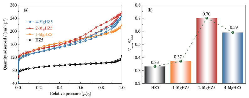 为进一步探讨Mg引入对ZSM-5分子筛织构性质的影响,对制备的样品进行了N2吸附-脱附测试,结果如图 5和表 2所示。显然,在图 5a中4个样品的等温线均在较低的相对压力(p/p0 < 0.1)下出现了陡增,这表明所有样品均具有典型分子筛的微孔结构。特别的是,2-MgHZ5和4-MgHZ5的N2吸附-脱附等温线在较高的相对压力下(0.4 < p/p0 < 0.9)表现为带有明显滞后环的Ⅳ型等温线,具有典型的介孔特征。相应地,HZ5和x-MgHZ5的比表面积和孔结构参数如表 2所示。由表可见,随着Mg引入量的提高,样品的外比表面积从HZ5的120 m2·g-1上升至136~149 m2·g-1,总孔体积从0.18 cm3·g-1增加至0.19~0.23 cm3·g-1,其中增幅主要来源于介孔孔体积的增大。因此,通过对比不同样品的介孔体积与总孔体积的比值(Vmeso/Vtotal)(图 5b),可以合理推测,x-MgHZ5中介孔的存在与引入杂原子Mg密切相关。当引入的Mg含量较高时,部分骨架Mg原子会在后续的煅烧和离子交换过程中被移除,从而形成介孔。类似的现象在其他杂原子引入分子筛的研究中也有发现:例如,Li等[40]将硼(B)杂原子引入MFI分子筛骨架后,通过后处理也观察到了介孔的存在;同样,Meng等[41]将锡(Sn)原子引入Y型沸石后,也发现了介孔的形成。