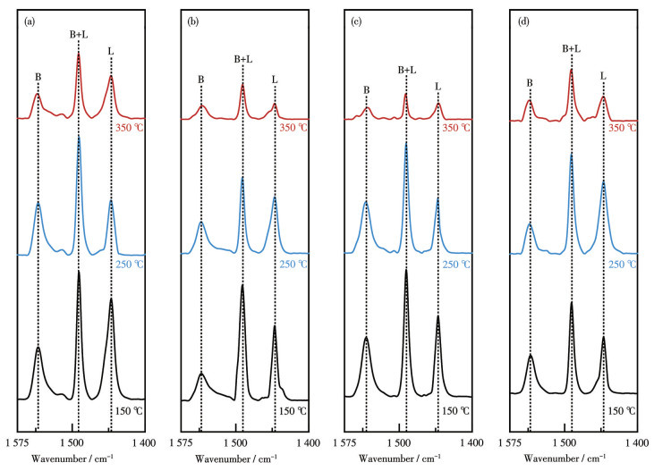 NH3-TPD和Py-IR是常用的表征分子筛酸性质的技术,适用于测定HZSM-5分子筛的酸强度和含量。在图 6a的NH3-TPD曲线中,峰面积的大小正比于酸量,而出峰温度的高低则反映了酸强度的强弱[42],可以看出4个样品的酸性质较为相似。从拟合NH3-TPD曲线(图 6b)可以看出,所有样品都显示出3个明显的峰,其中低温脱附峰(100~280 ℃)对应HZSM-5分子筛的弱酸位点,中高温脱附峰(280~380 ℃)对应中强酸位点,高温脱附峰(380~500 ℃)对应强酸位点[43-44]。根据拟合曲线的峰面积计算分子筛的酸量,结果列于表 3。由此可见,随着Mg含量的增加,分子筛的总酸量和强酸量略有下降,这主要是由于Mg进入骨架后,其电负性低于Al,对邻近B酸位点的强度产生了调变作用,而非简单的离子交换中和[45]。值得注意的是,Mg的引入对酸强度的改变并无一致的单调性规律,但改变了弱、中、强酸位的分布比例。这种酸分布的调变,可能是由于Mg进入骨架后,改变了AlF的局域配位环境所致[46]。
