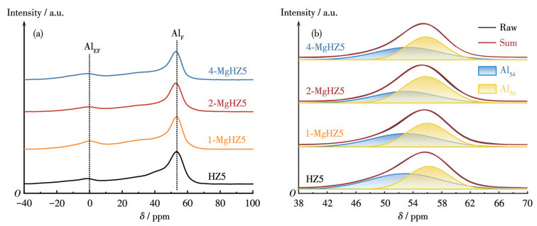 图 8为不同Mg含量HZSM-5分子筛的27Al MAS NMR谱图。如图 8a所示,所有样品均在化学位移(δ)为0和45~60处出现2个峰,分别对应六配位非骨架铝(AlEF)和四配位骨架铝(AlF)[49]。通过比较δ为0处的峰面积变化(表 5)可知,随着Mg含量的提高,分子筛样品的AlEF含量略有降低,推测可能是Mg以Si—O—Mg的形式进入分子筛骨架后,对AlF有稳定作用,减少了Al从骨架中脱除形成AlEF的可能。而AlEF通常与L酸位点相关,其含量下降可能使RB/L上升,这与Py-IR结果相吻合[45, 50]。此外,根据文献报道[18],27Al MAS NMR在δ为54处的峰归属于通道交叉处的AlF位点,δ为56处的峰可归属于正弦通道或直通道处的AlF位点。表 5列出了分峰拟合后的结果。由此可见,随着Mg的引入,x-MgHZ5在δ为54处的峰所占的峰面积比(29.4%~40.1%)远小于HZ5(48.6%),说明x-MgHZ5中有更多的AlF分布在直通道或正弦通道中,且随着Mg含量的增加,更多的Al分布在了直通道或正弦通道中。