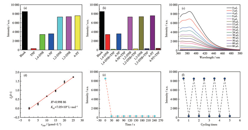 Figure 5  (a) Fluorescence intensity of 1 in the presence of different nitro-explosives; (b) Fluorescence intensity of 1 in the presence of other nitro-explosives and TNP; (c) Fluorescence spectra of 1 upon gradual addition of TNP solution (5 mmol·L-1); (d) S-V plot for 1 detecting TNP in DMF suspension at the low concentration (0-25 μmol·L-1); (e) Time-dependent fluorescence intensity for 1 detecting TNP; (f) Cyclic stability for 1 detecting TNP