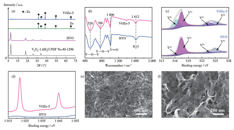 图 1. (a) VOZn负极原位自组装过程的示意图; (b) HVO悬浮液的光学照片; HVO的(c、d) SEM图和(e、f) TEM图; (g) VOZn-5的光学照片Figure 1. (a) Schematic illustration of the in-situ self-assembly process of VOZn anode; (b) Optical image of HVO suspension; (c, d) SEM and (e, f) TEM images of HVO; (g) Optical image of VOZn-5XRD分析表明,HVO的衍射图与V2O5·1.6H2O的标准卡片高度吻合,且未检测到杂相,证明了HVO的成功制备(图 2a)。此外,通过原位自组装策略,得到了一体化的VOZn负极。VOZn的XRD图中强的特征峰归属于金属锌,15°前出现的弱衍射峰则归属于HVO,表明VOZn复合结构的成功构建。图 2b为HVO和VOZn的FTIR谱图。位于526和766 cm-1处的吸收峰归属于V—O—V键;1 006和1 612 cm-1处的特征峰分别归属于V=O键和结晶水[26-27]。这些特征峰的出现证实了HVO在锌负极表面的成功构建,为观察HVO在锌表面的形貌,对VOZn-5进行了SEM表征(图 2e、2f)。结果显示,HVO均匀分布在金属锌表面,且形貌未发生明显变化。