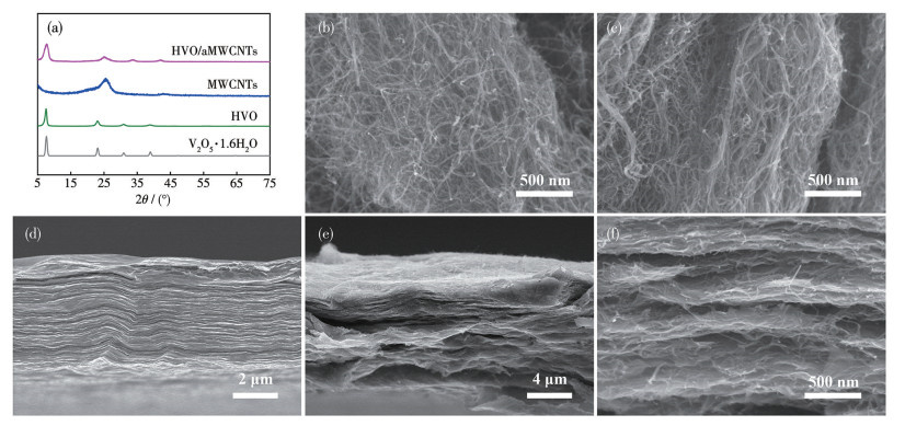 通过XRD和SEM对HVO/aMWCNTs复合薄膜的结构和形貌进行表征。MWCNTs的XRD图在25.6°处出现特征峰,而HVO/aMWCNTs复合薄膜的XRD图中同时出现了MWCNTs和HVO的特征峰,证明二者成功复合(图 4a)。原始MWCNTs呈连续、光滑的长线状结构且相互缠绕(图 4b),aMWCNTs的直径有所增加,可能是氧化作用所致(图 4c)。HVO薄膜中的HVO纳米片紧密堆叠,形成致密结构(图 4d),不利于电解液浸润,且导电性较差,难以作为理想的水系锌离子电池正极材料,因此,我们引入aMWCNTs作为导电剂。在HVO/aMWCNTs复合薄膜中,aMWCNTs与HVO相互交联形成多孔导电网络,有利于电子和离子的快速传输(图 4e、4f)。