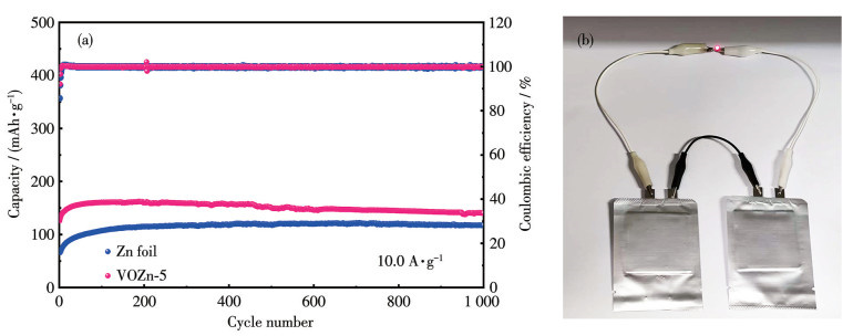 为进一步验证VOZn负极的实际应用性能,制备了VOZn-5||HVO/aMWCNTs软包全电池。如图 7a所示,该软包电池在10.0 A·g-1的电流密度下最大放电比容量为161.99 mAh·g-1,远高于基于锌箔负极的电池(121.11 mAh·g-1),且在1 000次循环中表现出良好的稳定性。此外,演示实验表明,将2个VOZn-5||HVO/aMWCNTs软包电池串联可点亮一个LED(发光二极管)小灯泡(图 7b),证明其具备一定的实际应用潜力。