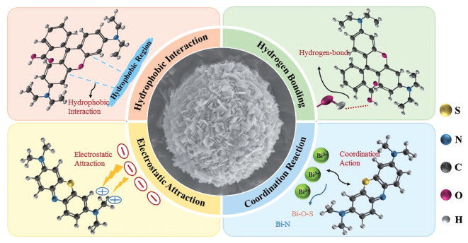 采用表面活性剂辅助水热法成功合成了Bi4Ti3O12光催化剂,并系统研究了其对不同染料的吸附与光催化降解机理。研究表明,该方法可有效调控Bi4Ti3O12的形貌结构,获得具有高比表面积的类球状纳米材料,其带隙窄化至2.46 eV。所得BTO-2对RhB的降解率高达98.5%,在连续5次循环实验后仍保持在96%以上,表现出优异的循环稳定性。此外,表面活性剂的修饰显著增强了催化剂对染料的吸附能力:SDS修饰的BTO-1通过静电吸引作用显著提升了对阳离子染料MB的吸附性能;油酸钠修饰的BTO-2表现出强疏水性(接触角为126.5°),可与RhB分子间产生显著的疏水相互作用。FTIR分析进一步表明,吸附过程中氢键与配位作用也发挥了重要影响。综上,我们提出了“表面修饰-吸附-光催化”协同作用机制,这为设计高效有机污染物处理材料提供了理论依据,展现出良好的工业应用前景。