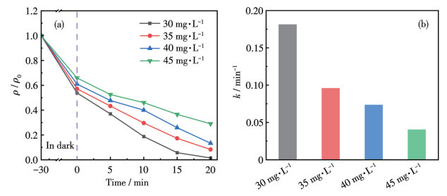 为了进一步分析Bi4Ti3O12的催化性能,对不同初始质量浓度(30、35、40、45 mg·L-1)的RhB溶液的降解性能进行了探究,结果如图 6a所示。在20 min光照反应后,RhB的降解率呈现出明显的浓度依赖性,30、35、40和45 mg·L-1时的降解率分别为98.5%、91.6%、86.6%和70.9%。反应速率常数随着染料质量浓度的升高而降低(图 6b),说明高质量浓度的染料分子在溶液中对光的竞争吸收和对催化剂表面活性位点的竞争吸附增强,这限制了光催化反应的效率[35]。这表明在处理高浓度废水时,需要适当延长反应时间以提升处理效果。