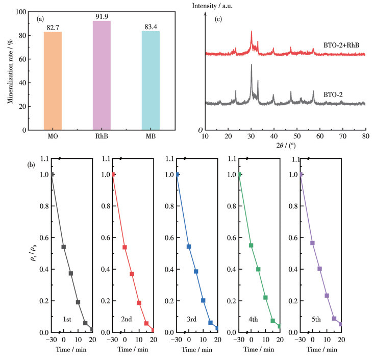 选取典型样品BTO-2探究了降解不同染料的矿化率。如图 7a所示,催化剂在MO(10 mg·L-1)、MB(20 mg·L-1)和RhB(30 mg·L-1)溶液中的矿化率分别为82.7%、91.9%、83.4%,表明染料分子发生了分解。由于瞬时有机中间体的存在,其矿化率没有降解率高[36]。随后进行了5次循环降解RhB实验,以测试BTO-2的重复性和稳定性(图 7b)。结果表明,5次循环后20 min内BTO-2对RhB的降解率仍高达94.8%,这表明其表现出优异的稳定性。对降解染料后的样品回收并进行了XRD测试,如图 7c所示,降解后样品中没有形成额外的相,但峰强度减弱,这可能与污染物的残留有关,表明BTO-2具有良好的可重复使用性和光催化性能。从表 1中可以看出,相比较其他催化剂,本实验中所制备的Bi4Ti3O12光催化剂表现出了优异的催化性能。