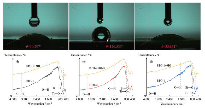 为了进一步研究有机染料溶液在Bi4Ti3O12上的吸附机理,测定了样品的接触角以及吸附染料前后的FTIR谱图,结果如图 9所示。阳离子染料MB的—NH2基团使得染料带正电,BTO-1中添加的SDS为阴离子表面活性剂,表面富含磺酸基团(—SO3H),这使BTO-1的表面负电荷增加,有助于与MB产生强静电吸引,从而增加对染料的吸附。而RhB分子中含有疏水芳香环和烷基链,BTO-2经表面活性剂油酸钠疏水改性后,接触角由33.86°(图 9c)增加到126.54°(图 9b),说明其疏水性增加。其疏水性与RhB染料分子中存在的疏水结构产生疏水相互作用,进而增强了对RhB染料的吸附[44]。MO染料为阴离子染料,表面带负电,由于静电排斥作用导致吸附性较差。如图 9d所示,BTO-1吸附MB后,FTIR谱图与原始略有不同,位于3 411、1 630 cm-1附近的特征峰略微增强,表明BTO-1表面富含的羟基作为氢键供体与作为氢键受体的MB染料分子两端的二甲铵基团(—N(CH3)2)发生氢键作用。同样,从图 9e中也观察到了BTO-2特征峰增强的现象,这主要是由于RhB中羧基(—COOH)作为氢键受体与BTO-2的羟基发生氢键作用所致[45]。值得注意的是,在BTO-1吸附MB染料分子后,Bi—O键特征峰的位置发生了略微偏移,从808 cm-1处偏移到了817 cm-1,表明MB分子中富含孤对电子的杂原子与Bi4Ti3O12表面的金属离子Bi3+发生配位作用,形成了配位键。由此可知,染料在样品上的吸附行为是多种相互作用共同影响的结果。图 10为催化剂样品吸附染料分子的吸附机理图。